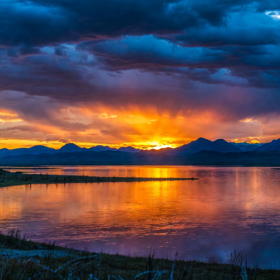 alpine lake, calm water, clouds, dramatic sky, dusk, evening, golden light, grass, horizon, lake, landscape, mountains, nature, orange sky, outdoors, peaks, purple clouds, reflection, scenery, shore, sky, sunlight, vibrant colors, water, wilderness, sunset