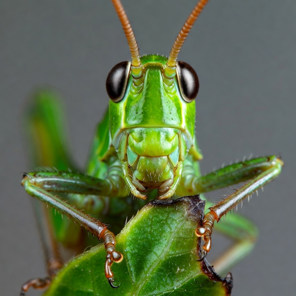 A close-up view of a vibrant green grasshopper with large black eyes and orange antennae. It grips a fresh green leaf with its spiny legs while munching on it. The insect is positioned against a plain gray background.