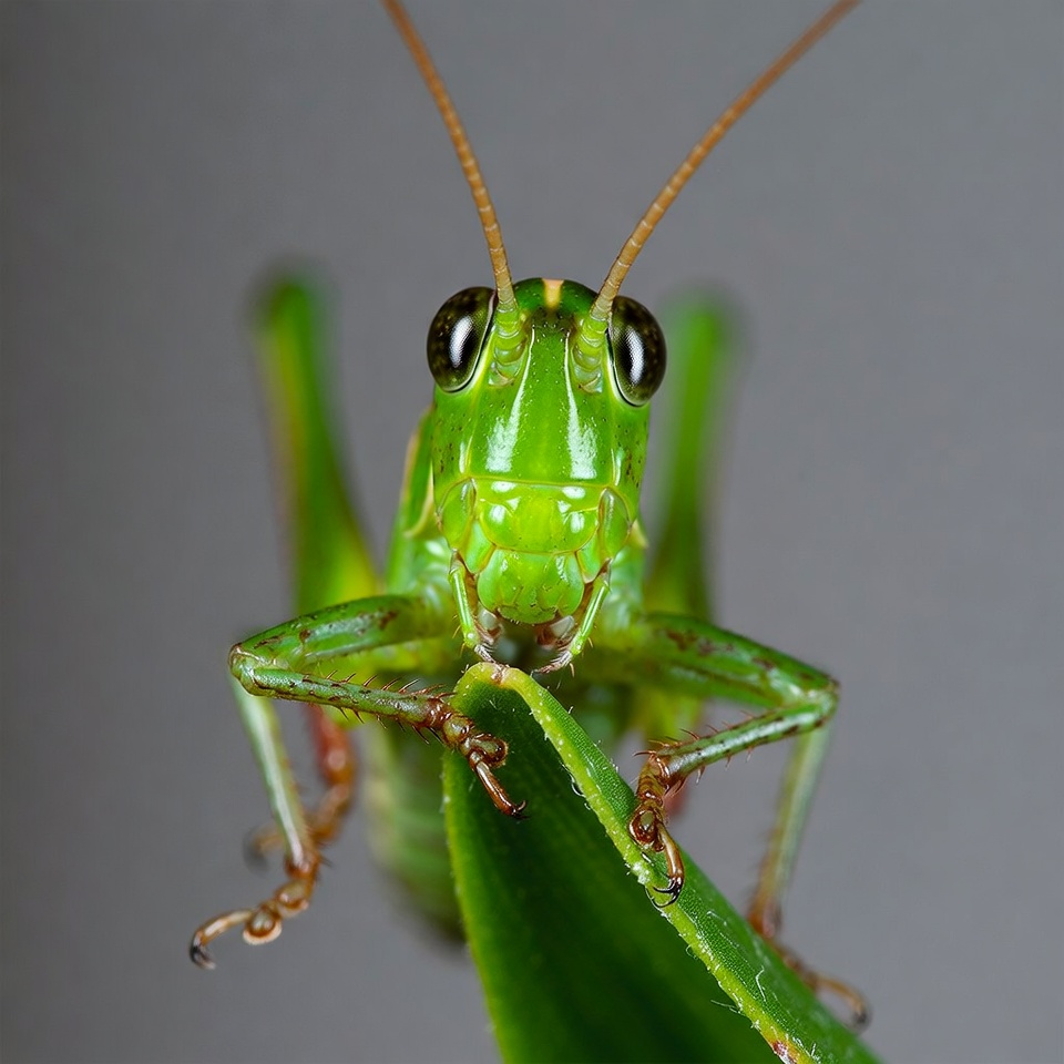 A vibrant green grasshopper with large black eyes and long antennae clings to a fresh green leaf. Its detailed legs grip the leaf edge firmly. The insect faces forward against a blurred gray background.
