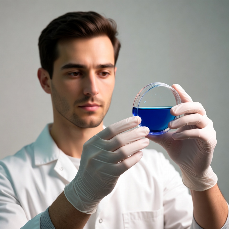 A young man with short dark hair wears a white lab coat and blue nitrile gloves while holding a clear petri dish containing bright blue liquid. He stands against a plain white background in a laboratory setting. His expression is focused as he examines the sample closely.