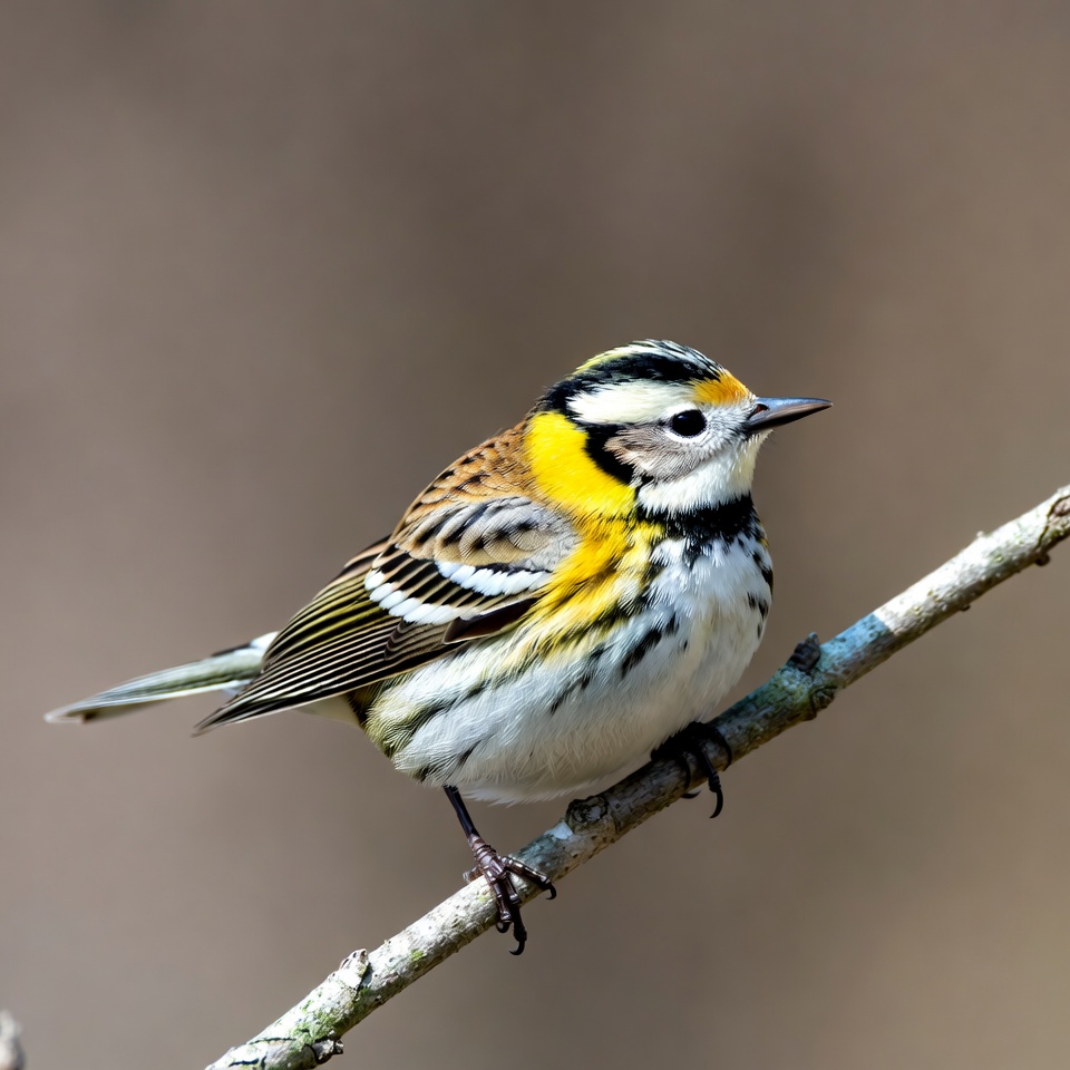 avian, bird, bird on branch, birdwatching, black stripes, branch, feathers, nature, perching bird, small bird, songbird, striped bird, warbler, white underparts, wildlife, yellow bird, yellow patch, yellow-rumped warbler