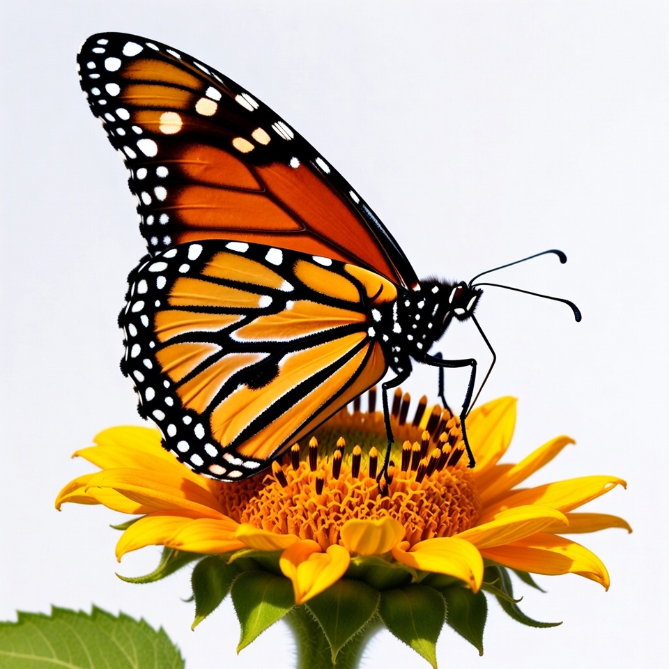 black spots, butterfly, flower, insect, isolated background, macro, nature, orange wings, petals, pollination, stem, sunflower, vibrant colors, wildlife, wings, yellow flower, monarch butterfly