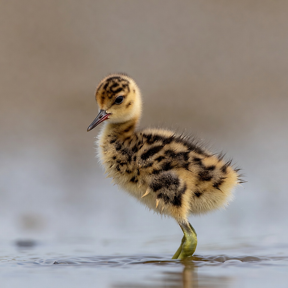 Fluffy baby killdeer chick standing in water