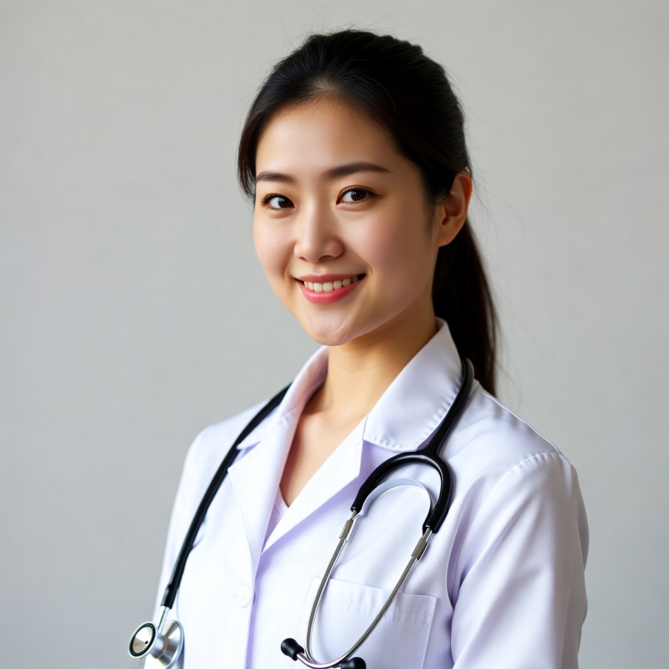 A young Asian woman wearing a white doctor's coat stands smiling with a stethoscope around her neck. She has dark hair tied in a ponytail and is posed confidently against a plain gray background. Her expression is friendly and professional.