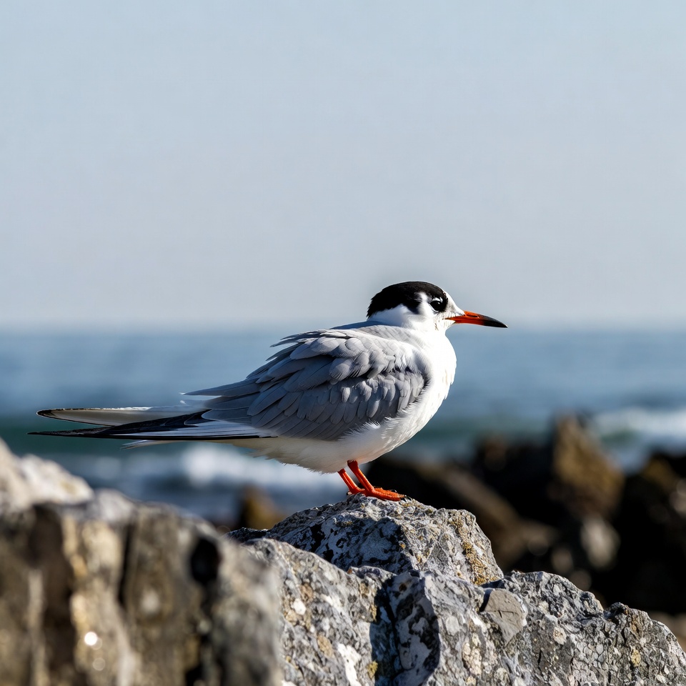 avian, birdwatching, black cap, blue sky, feathers, isolated background, nature, ocean, orange legs, profile view, red beak, rock perch, seabird, seaside, shore, tern bird, waves, white bird, wildlife, common tern
