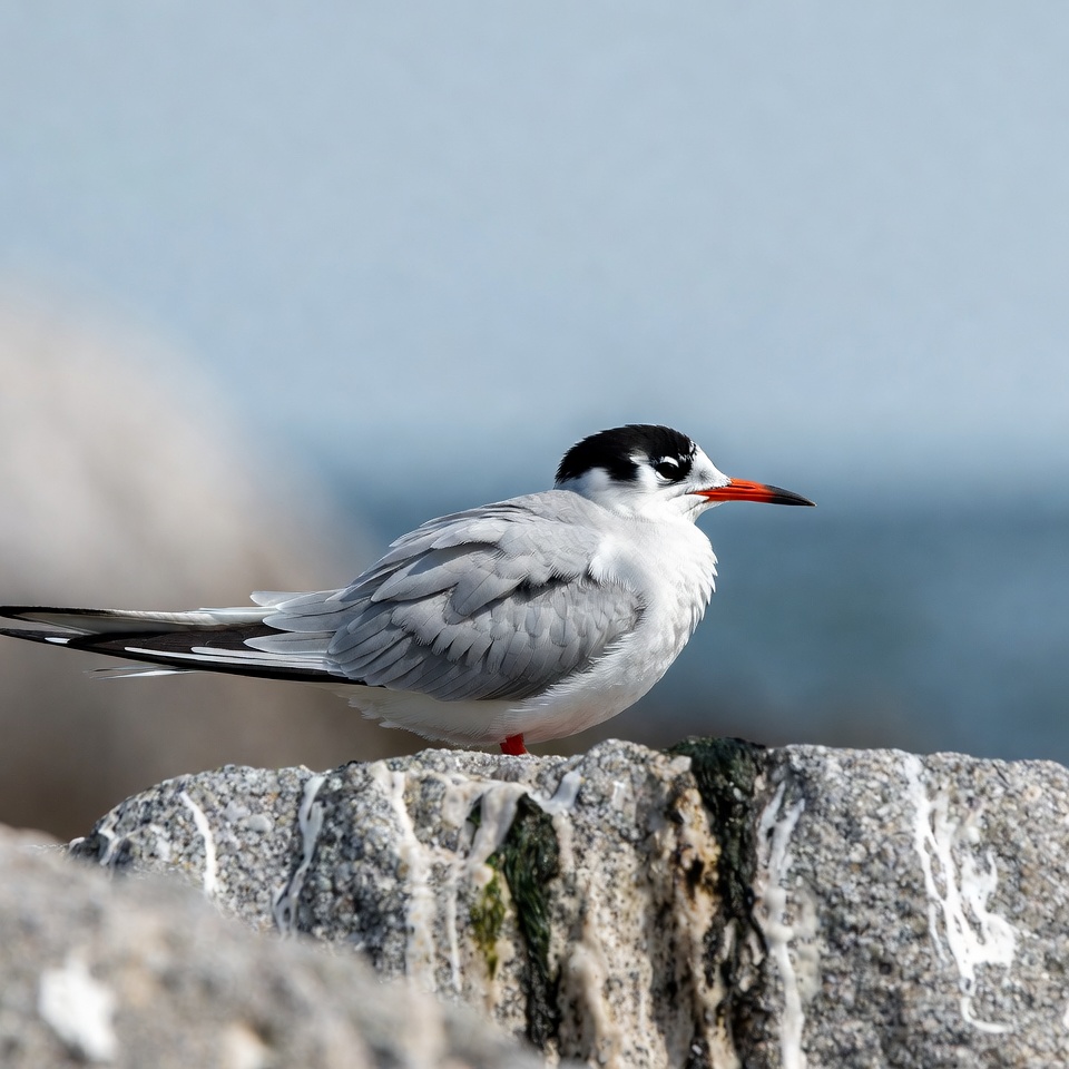 avian, bird watching, black cap, black tail, blue sky, coast, feathers, mossy rock, nature, ocean background, red bill, rocky shore, sea bird, seabird, shore bird, standing bird, tern bird, white bird, wildlife, common tern