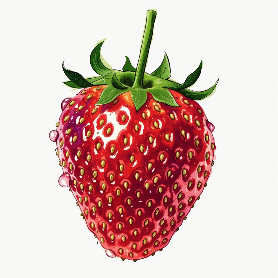 A vibrant red strawberry illustration features glossy water droplets on its surface. The berry has a green stem and leaves at the top, with detailed seeds visible across its body. It is depicted on a plain white background.