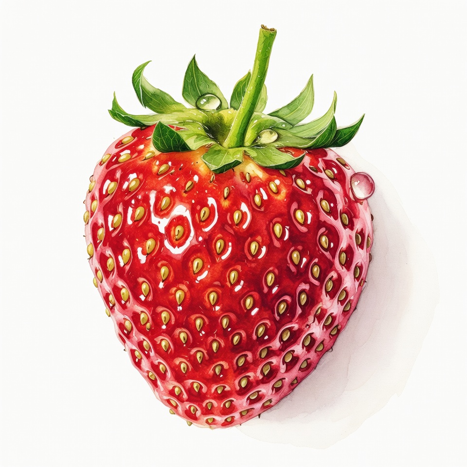 berries, closeup, detailed, dew drops, food, fresh strawberry, fruit, green leaves, illustration, isolated background, juicy, nature, realistic, red strawberry, ripe, seeds, stem, water droplets, watercolor, strawberry