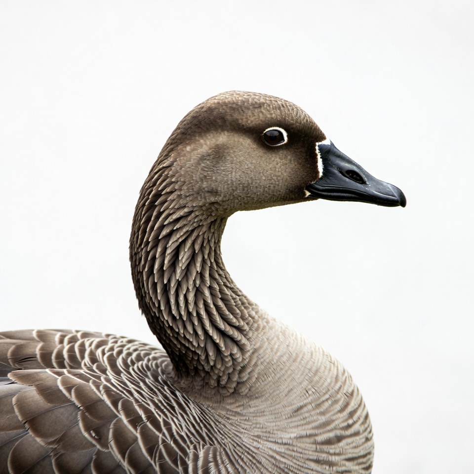 A brown nene goose with a black bill and white cheek patch faces sideways against a plain white background. Its feathers show detailed gray-brown patterns on the neck and body. The goose has a distinctive curved neck and alert eye.