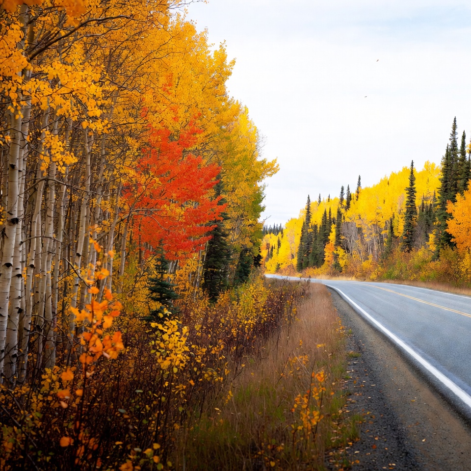 aspen trees, cloudy sky, evergreens, fall colors, fall foliage, forest path, golden trees, grass, hills, nature landscape, orange leaves, road trip, rural road, scenic drive, trees, winding road, yellow leaves, autumn