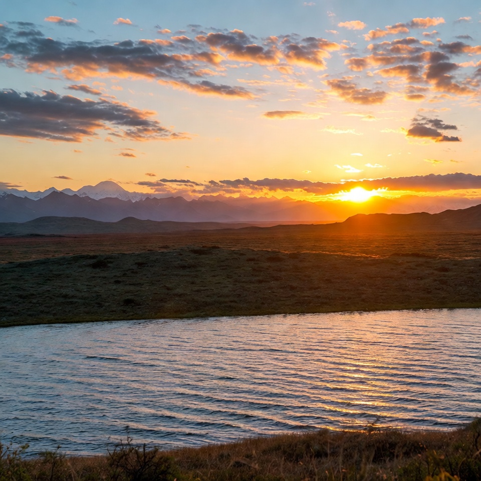 A vibrant sunset illuminates snow-capped mountains in the distance with orange and pink hues. A calm lake reflects the colorful sky, surrounded by grassy hills and scattered clouds. The sun hovers low above the rugged horizon.