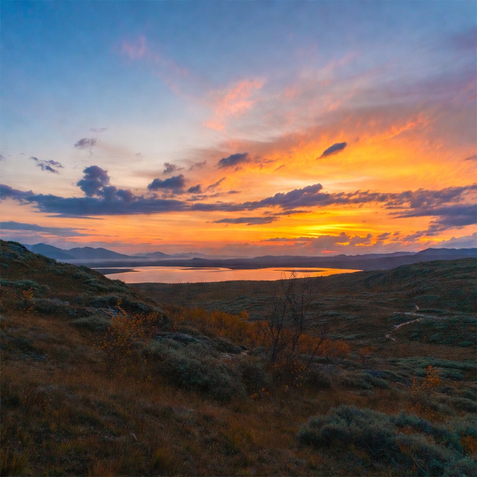 autumn, blue sky, clouds, dusk, golden hour, grass, hills, horizon, lake, landscape, mountain, nature, orange sky, outdoors, path, pink sky, reflection, remote lake, scenery, scenic view, sky, sunrise, water, wilderness, sunset
