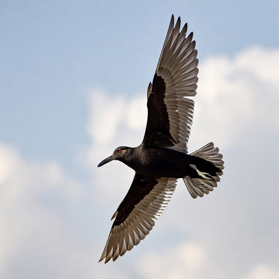 avian, bird flying, bird in flight, black wings, blue sky, clouds, feathers, isolated background, long bill, nature, red eyes, shorebird, soaring bird, tail feathers, wading bird, white wings, wildlife, black-winged stilt