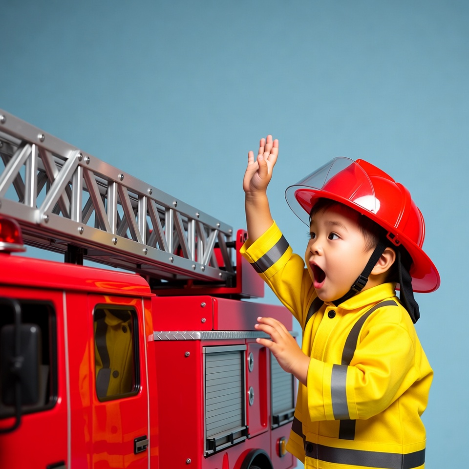 Asian, blue background, child, children's toy, costume, emergency vehicle, excited, firefighter, fireman outfit, happy child, illustration, isolated background, kids costume, ladder truck, playtime, raising hands, red helmet, red truck, silver ladder, toy fire truck, yellow uniform, young boy, boy