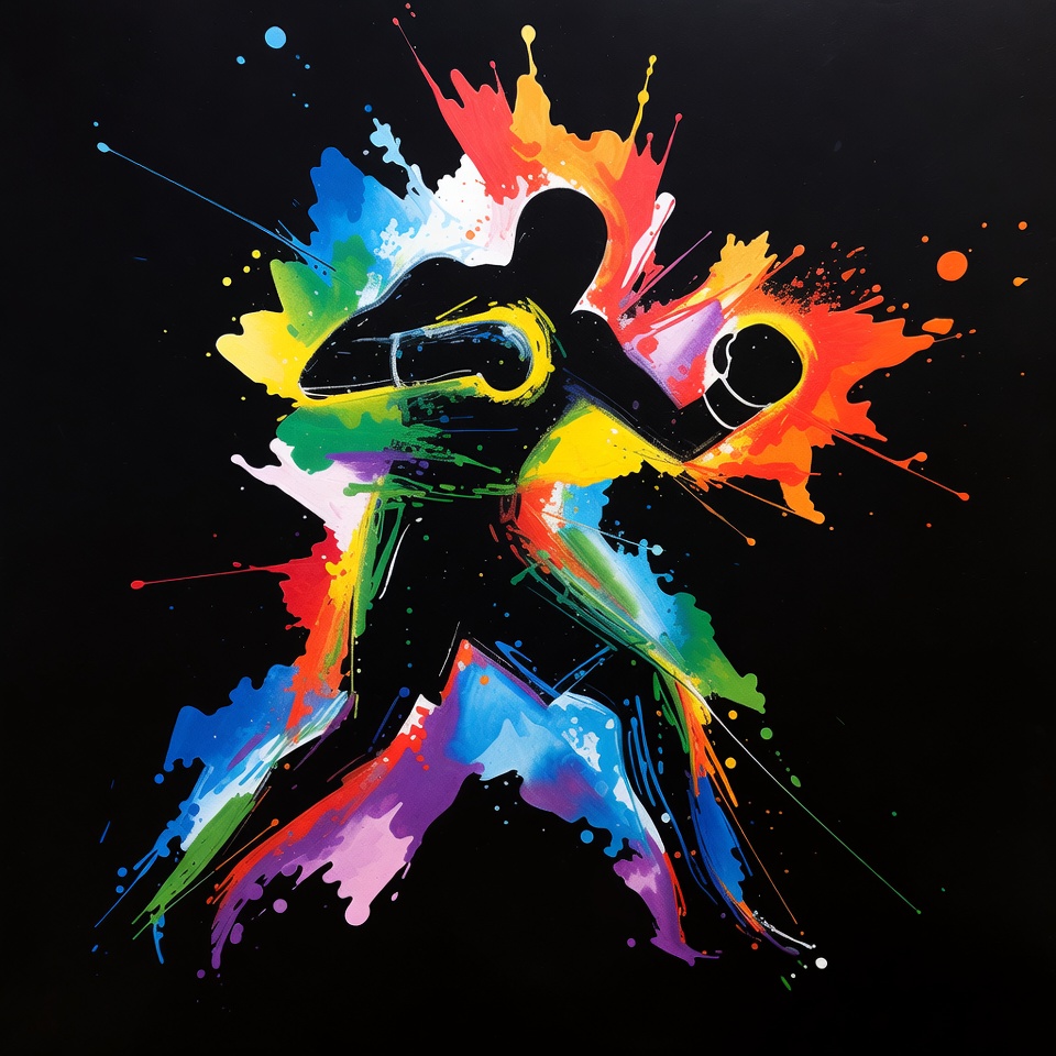 abstract art, action pose, black background, blue splash, boxing gloves, colorful splashes, dynamic, energetic, fighting pose, green splash, illustration, male, paint splatter, purple splash, red splash, silhouette, sports art, vibrant colors, yellow splash, boxer