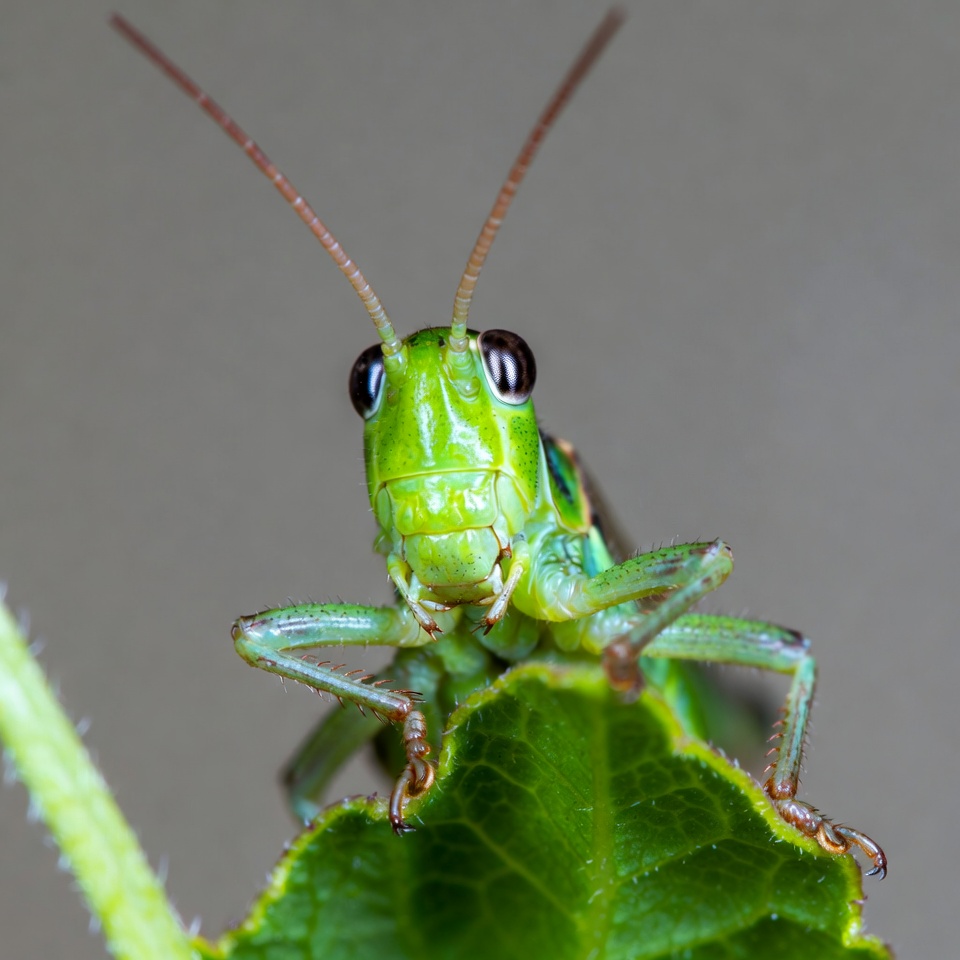 antennae, arthropod, black eyes, bug, close-up, green grasshopper, green leaf, insect, isolated background, leaf, legs, macro, nature, orthoptera, wildlife, grasshopper