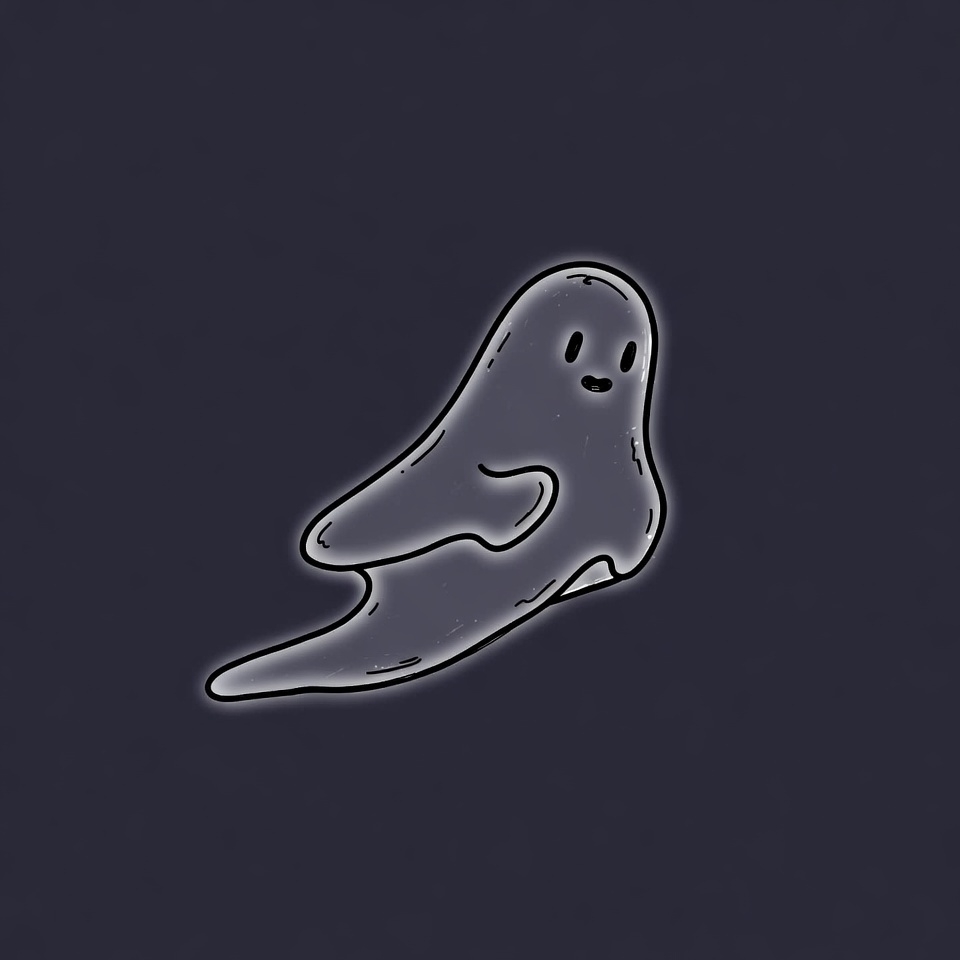 A simple line-drawn cartoon ghost floats on a dark background. The ghost has a white glowing body with expressive eyes and a small smile. It features wavy edges and arms in a gentle pose.