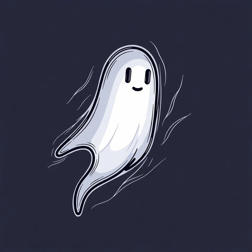 A simple cartoon ghost with white body, black outline, and large round eyes floats on a dark blue background. It has a cheerful smiling mouth and wavy ethereal trails extending from its base. The illustration features clean lines and a friendly, kawaii style.