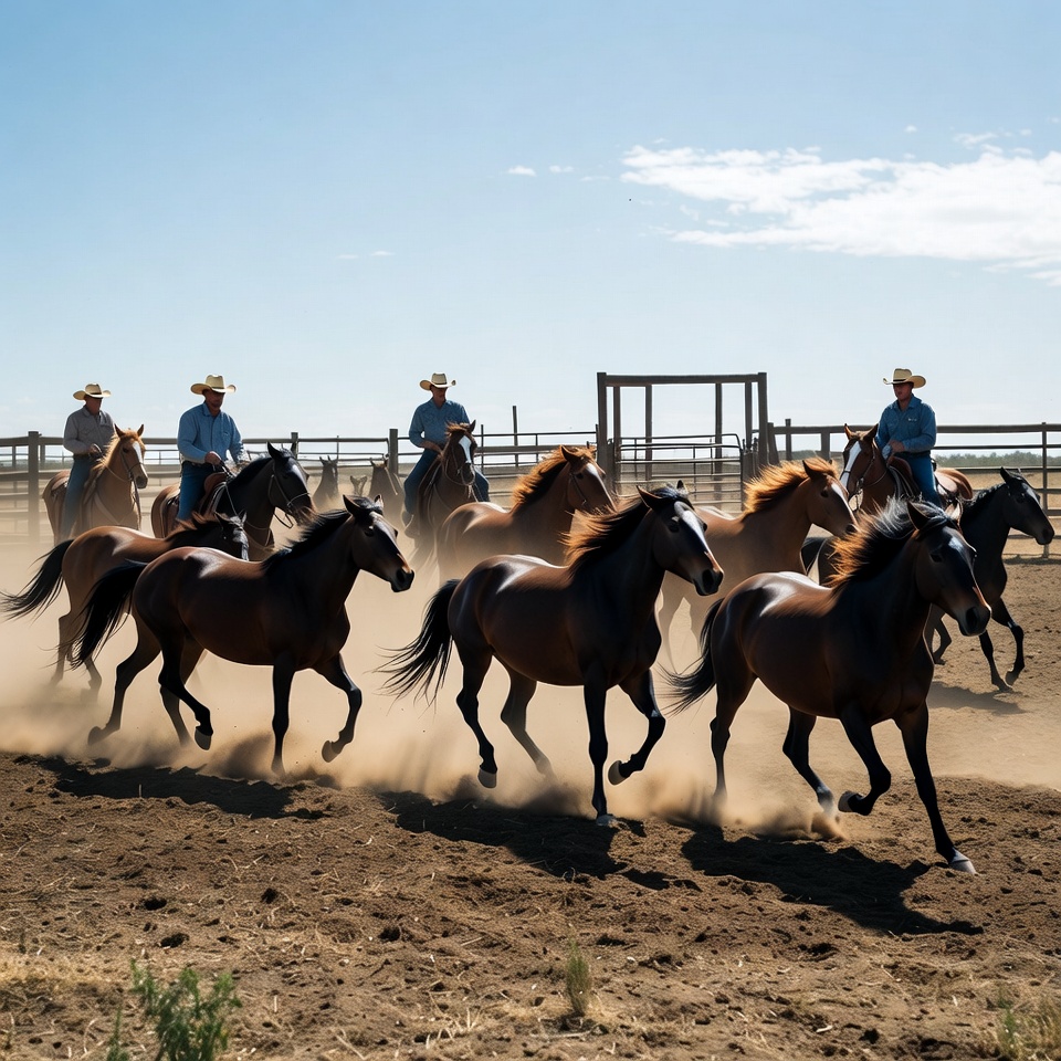 White, arena, blue sky, brown horses, corral, cowboy hats, dust, equestrian, galloping, herding, hooves, horses, livestock, men, motion, outdoor, ranch, riding horses, shirts, silhouettes, vegetation, western, wooden gate, cowboys
