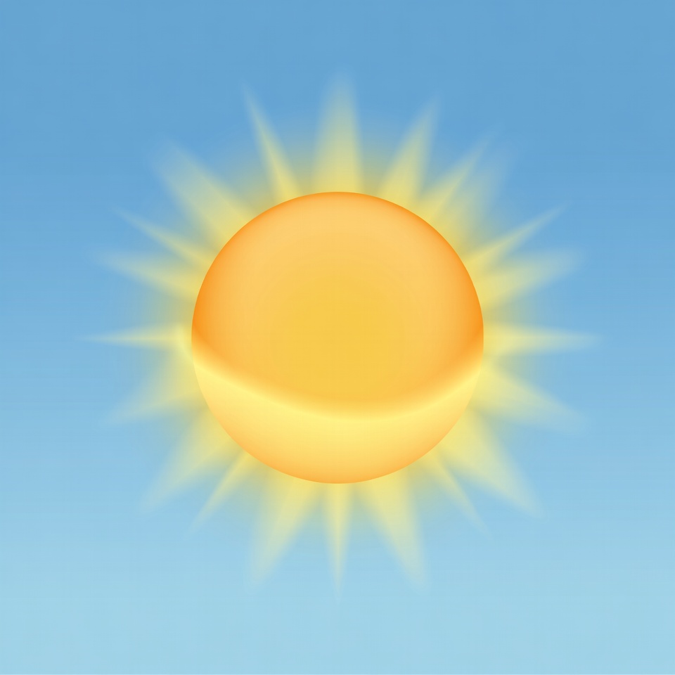 A vibrant orange sun with radiating rays shines against a clear blue sky. The sun is centered and depicted in a smooth, illustrative style. The background is uniformly sky blue with subtle glow effects around the sun.