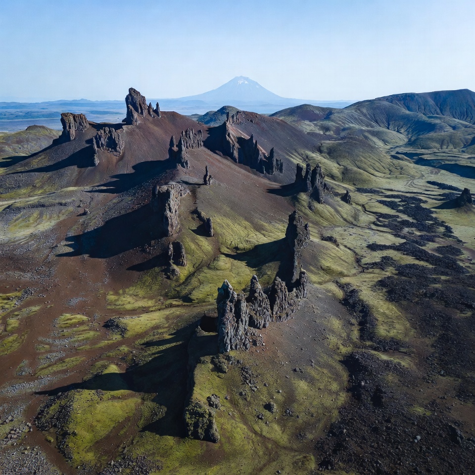 Iceland, aerial view, basalt pillars, brown hills, clear sky, distant peak, dramatic rocks, drone photo, earthy landscape, earthy tones, geology, green moss, hoodoos, landscape, mossy ground, mountains, nature, outdoor scenery, rock formations, rocky outcrops, rugged terrain, shadows, snow-capped mountain, volcanic landscape, volcanic rocks, volcano, wilderness, red rocks