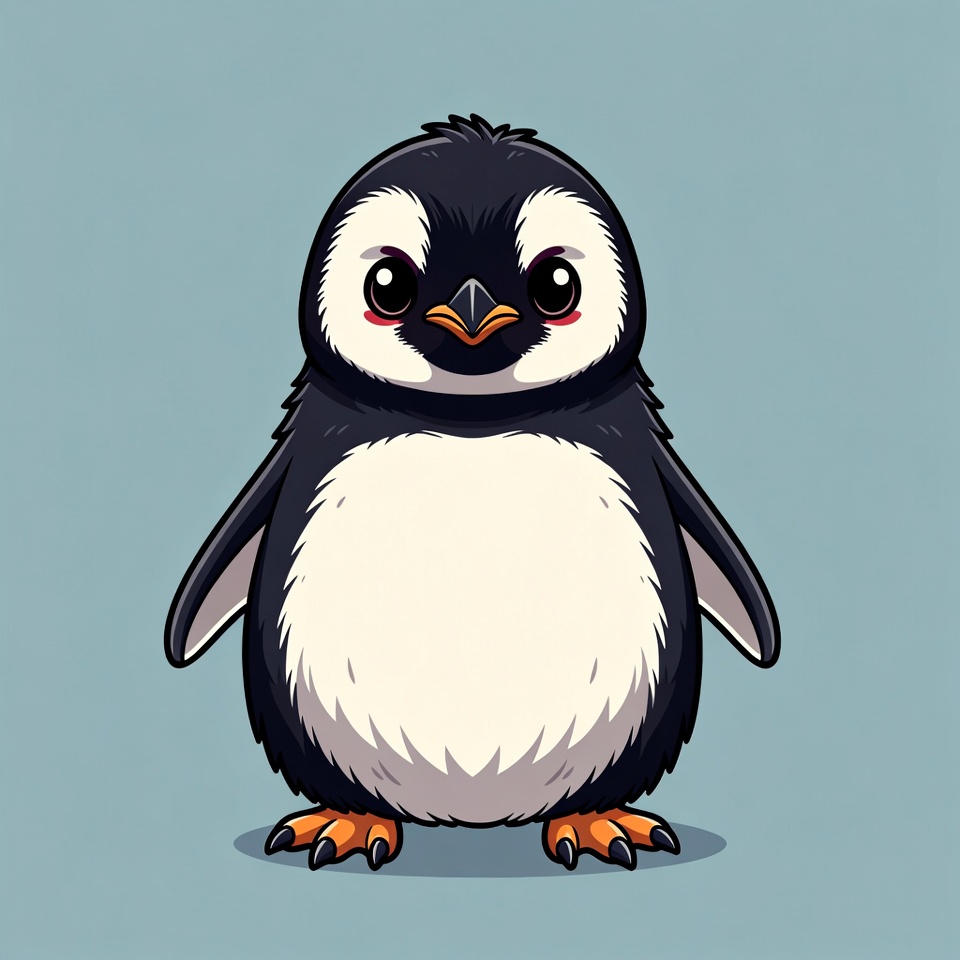 adorable animal, animal, baby penguin, big eyes, black white penguin, cartoon penguin, chubby penguin, clipart, cute penguin, fluffy feathers, illustration, isolated background, orange feet, vector art, penguin