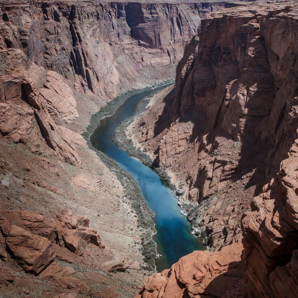 Arizona landmark, Colorado River, aerial view, arid terrain, blue water, canyon landscape, cliff edges, deep gorge, desert canyon, earthy tones, geological feature, layered rocks, national park, natural wonder, nature photography, outdoor scenery, red rock cliffs, river bend, river canyon, rock formations, scenic vista, sunny day, travel destination, turquoise river, vast canyon, winding river, Grand Canyon