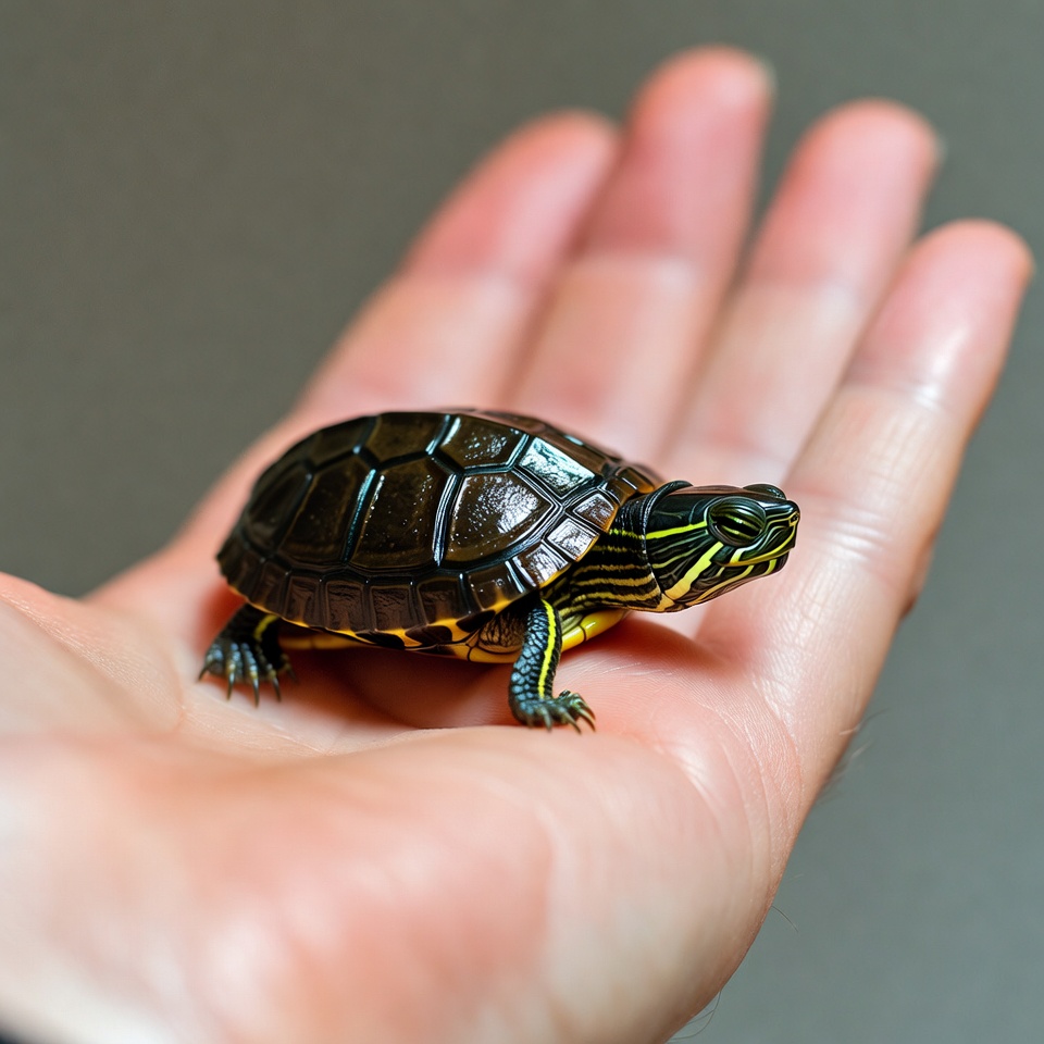 A small baby turtle with a dark shiny shell featuring yellow stripes rests in an open human hand. The turtle's head extends forward with green skin and yellow markings on its face and neck. The hand holds the turtle gently against a plain gray background.