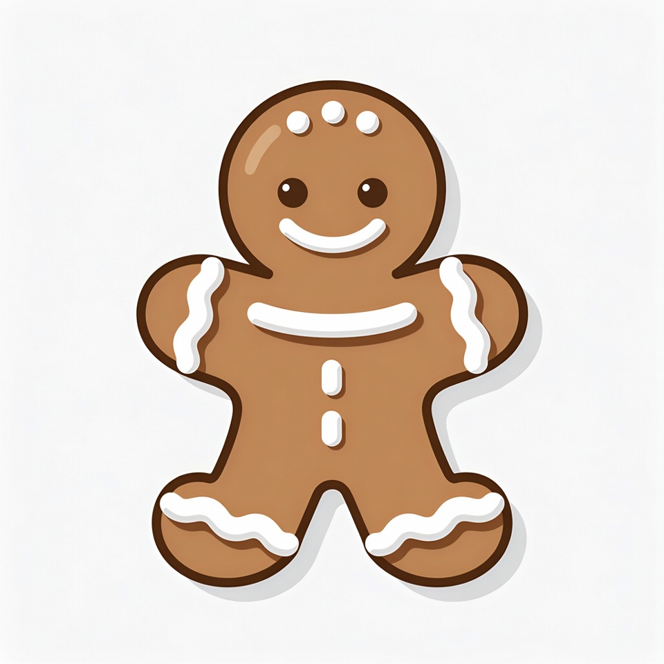 A cute cartoon gingerbread man stands on a white background with a big smile. It has brown gingerbread body, white icing outlines, three white buttons, and cheerful eyes. The illustration features glossy highlights and detailed icing trim on arms and legs.