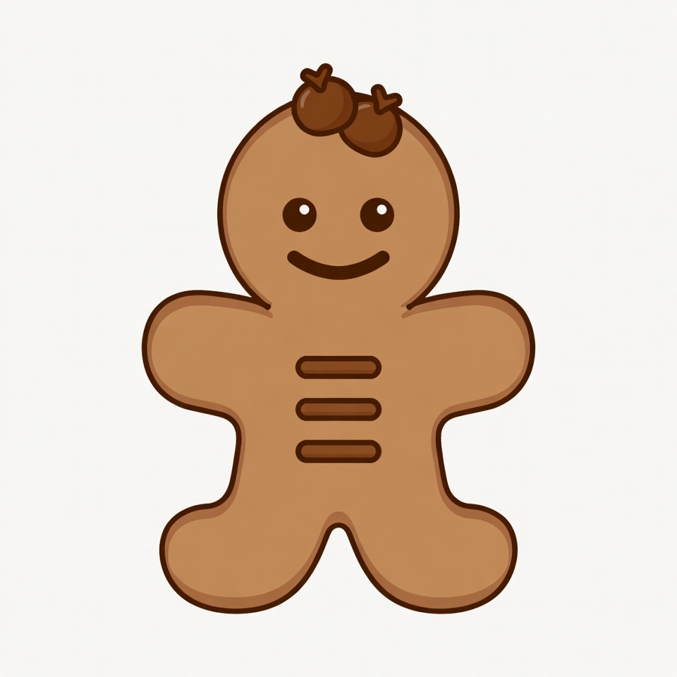 A cartoon gingerbread man stands smiling on a white background. It has big eyes, a cheerful smile, and two small brown bows on top of its head. The figure features three white icing buttons on its brown gingerbread body.