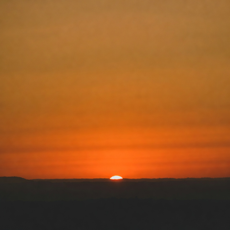 A vibrant orange sun sits low on the horizon at sunset. The sky transitions from deep orange near the sun to lighter yellow and hazy gradients above. Dark silhouettes of distant land or hills are visible at the bottom.