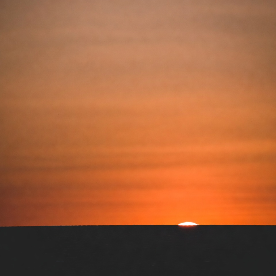 A vibrant orange sunset glows just above a dark flat horizon line. The sky transitions from deep orange near the sun to lighter hazy tones higher up. Wispy clouds streak across the warm-colored sky.