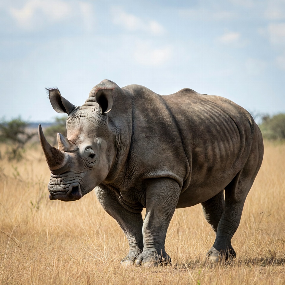 A large white rhinoceros stands in dry golden grass under a partly cloudy sky. Its prominent horn and thick skin are visible as it faces slightly to the side. Sparse bushes and open savanna landscape surround the animal.