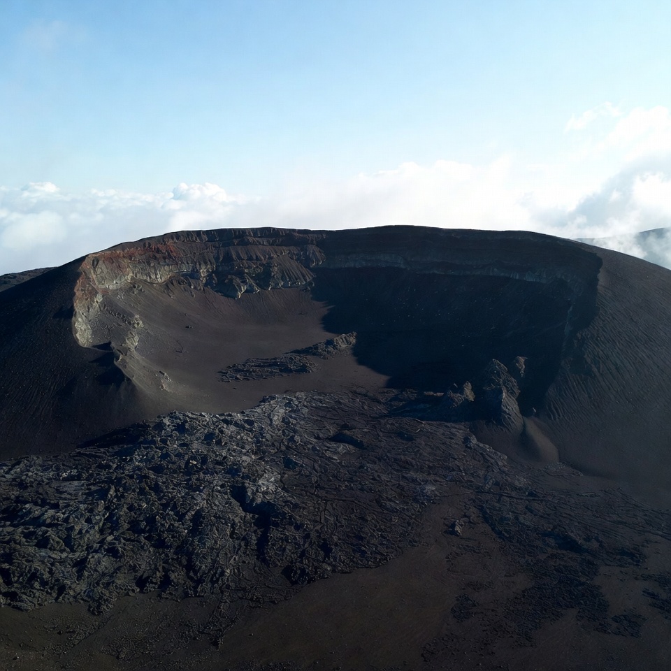 aerial view, ash slopes, black rock, blue sky, caldera, clouds, crater, earth science, geology, landscape, lava rim, mountain, nature, rugged terrain, volcanic crater, volcano