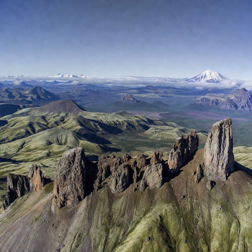 aerial view, blue sky, distant peaks, earth, geology, glaciers, green hills, hillside, landscape, mountains, nature, outdoors, peaks, ridges, scenery, snowy mountain, terrain, volcanic landscape, volcano, wilderness, rock formations