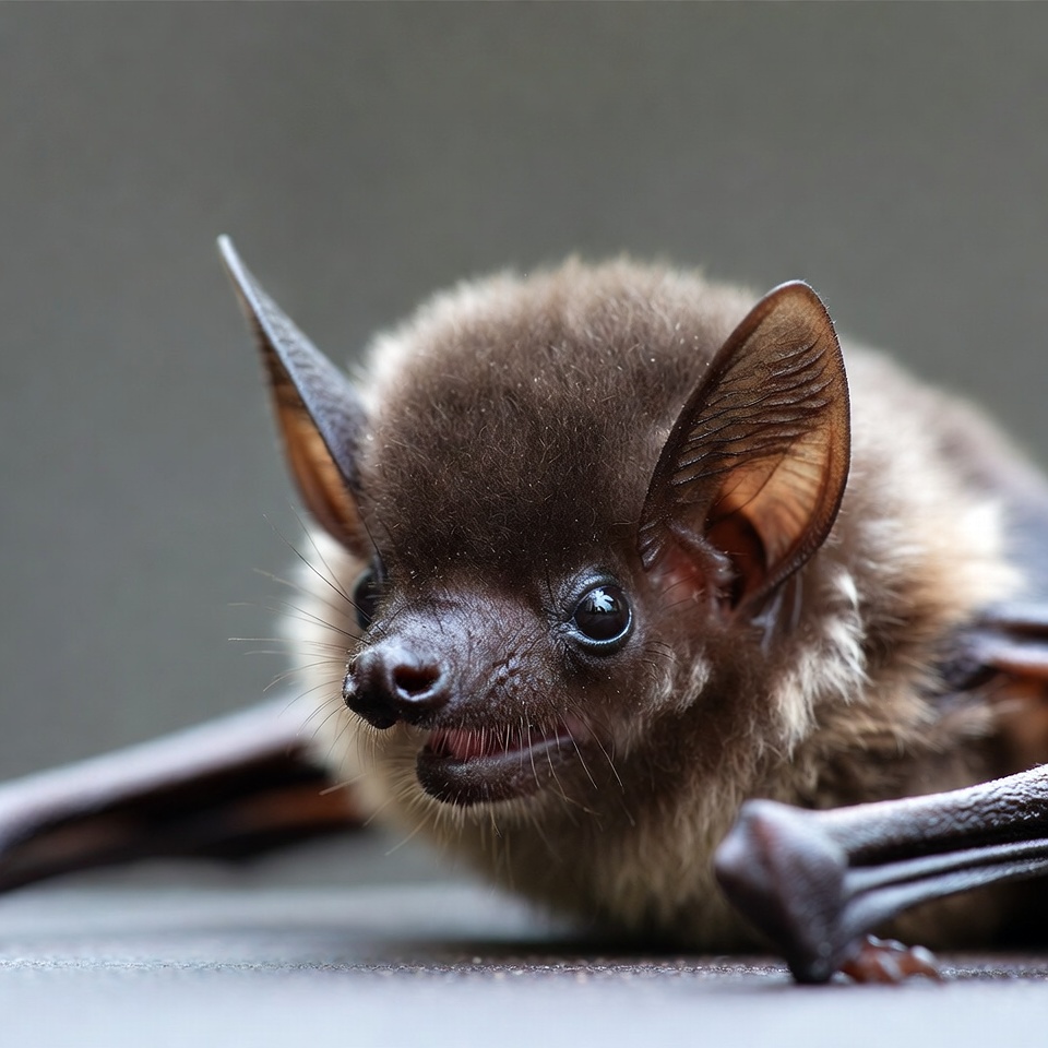 A brown bat with large ears and fluffy fur faces forward on a dark surface. Its eyes are wide open and expressive, with visible whiskers and wings partially spread. The bat appears alert with its mouth slightly open.