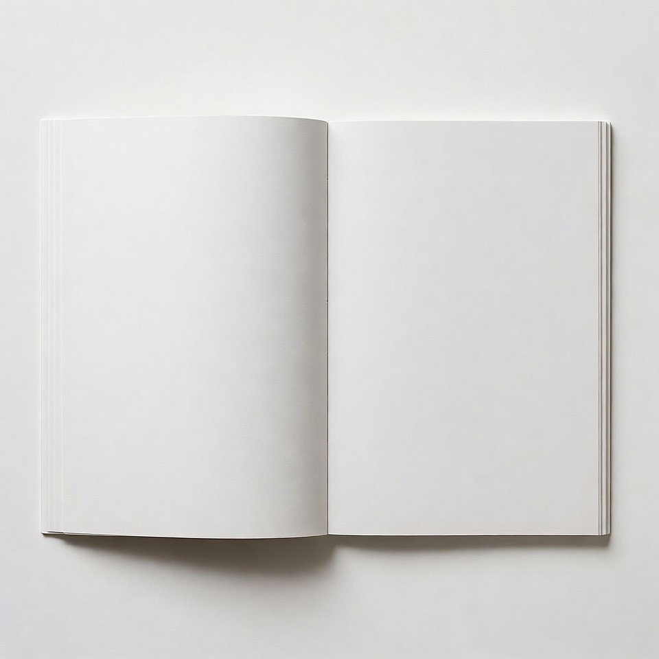 A white hardcover notebook lies open on a plain white background. Both pages are completely blank and pristine. The book is photographed from a top-down angle.