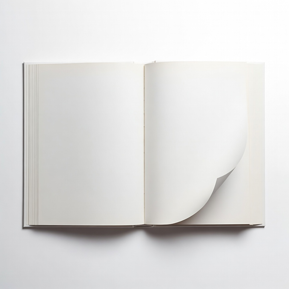 blank book, blank notebook, book corner, book mockup, book page, curled page, empty pages, hardcover book, isolated background, paper corner, reading book, top view, white background, white pages, open book