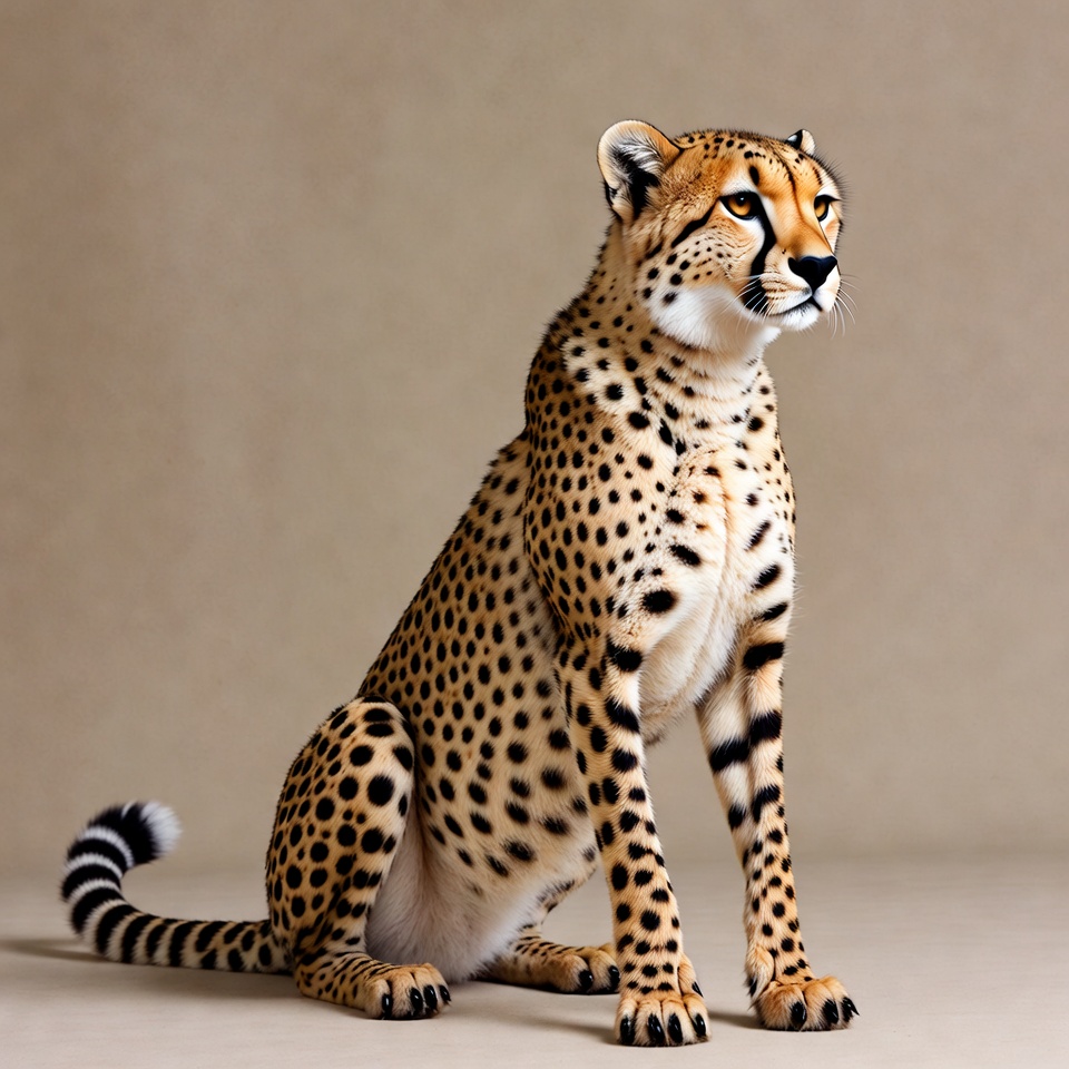 A cheetah sits upright with its front legs extended on a plain beige background. The animal features distinctive black spots on its tan coat, large rounded ears, and a long spotted tail curled to the side. It gazes slightly upward with intense yellow eyes.