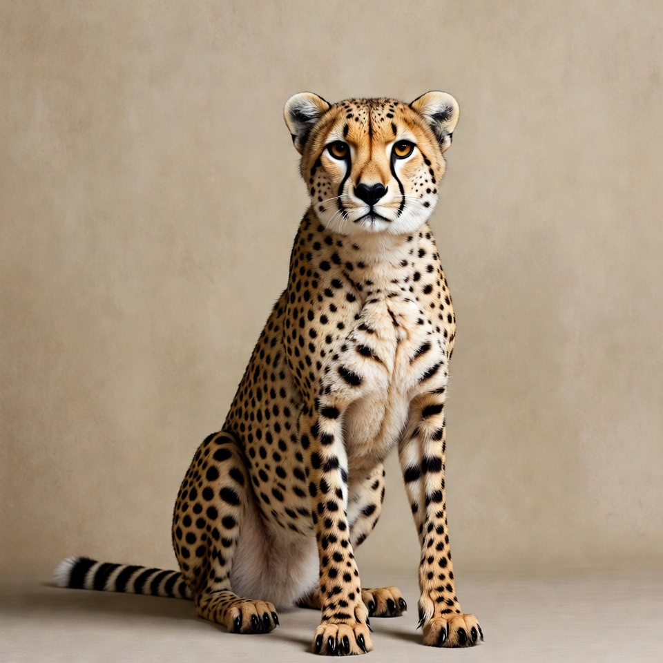 A cheetah sits upright with its front paws extended on a plain beige background. It has distinctive black spots on its golden fur, large rounded ears, and intense yellow eyes. Its long tail curls behind it.