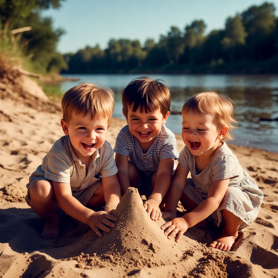 Three young children with blonde hair are kneeling on a sandy beach, joyfully building a sandcastle together. They wear light-colored short-sleeved shirts and shorts or a dress, with a calm river and green trees in the background under a sunny sky. The kids smile happily while shaping the sand with their hands.