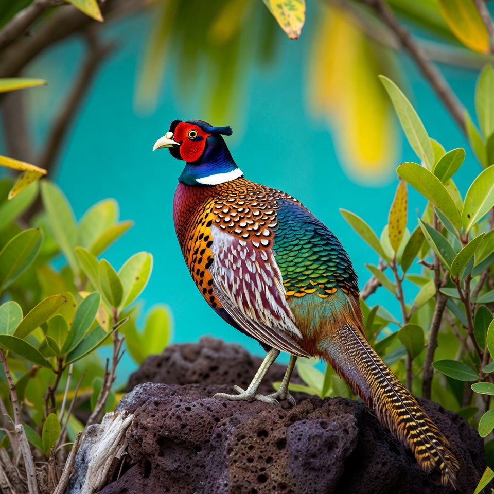 animal, bird, colorful feathers, green foliage, isolated background, long tail, male pheasant, nature, red face, tropical leaves, turquoise background, volcanic rock, white neck, wildlife, pheasant