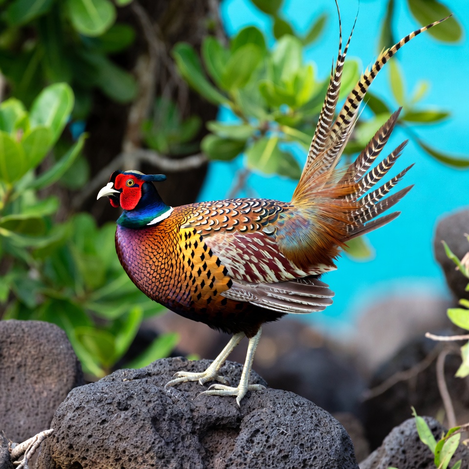 animals, bird standing, blue background, colorful feathers, eye pattern, feathers, golden feathers, green leaves, iridescent, isolated background, male peacock, nature, tail feathers, tropical bird, volcanic rock, wildlife, peacock