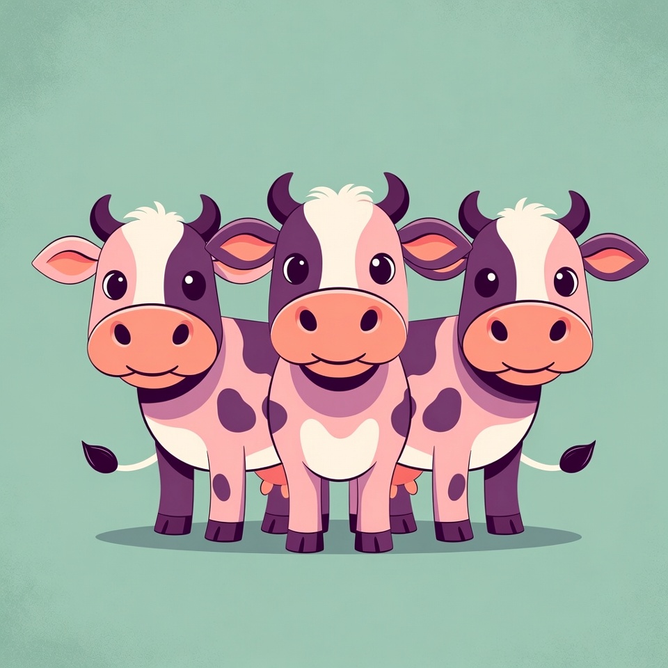 Three adorable cartoon cows with pink and white spotted bodies stand side by side on a light green background. They have large expressive eyes, small horns, and happy smiles. The illustration features simple, vibrant colors and clean lines.