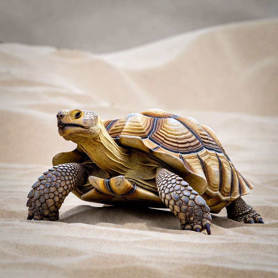 A detailed tortoise with yellow and brown patterned shell walks on sandy dunes. Its textured legs and head are prominently visible against the beige sand background. The scene features smooth sand hills in the backdrop.