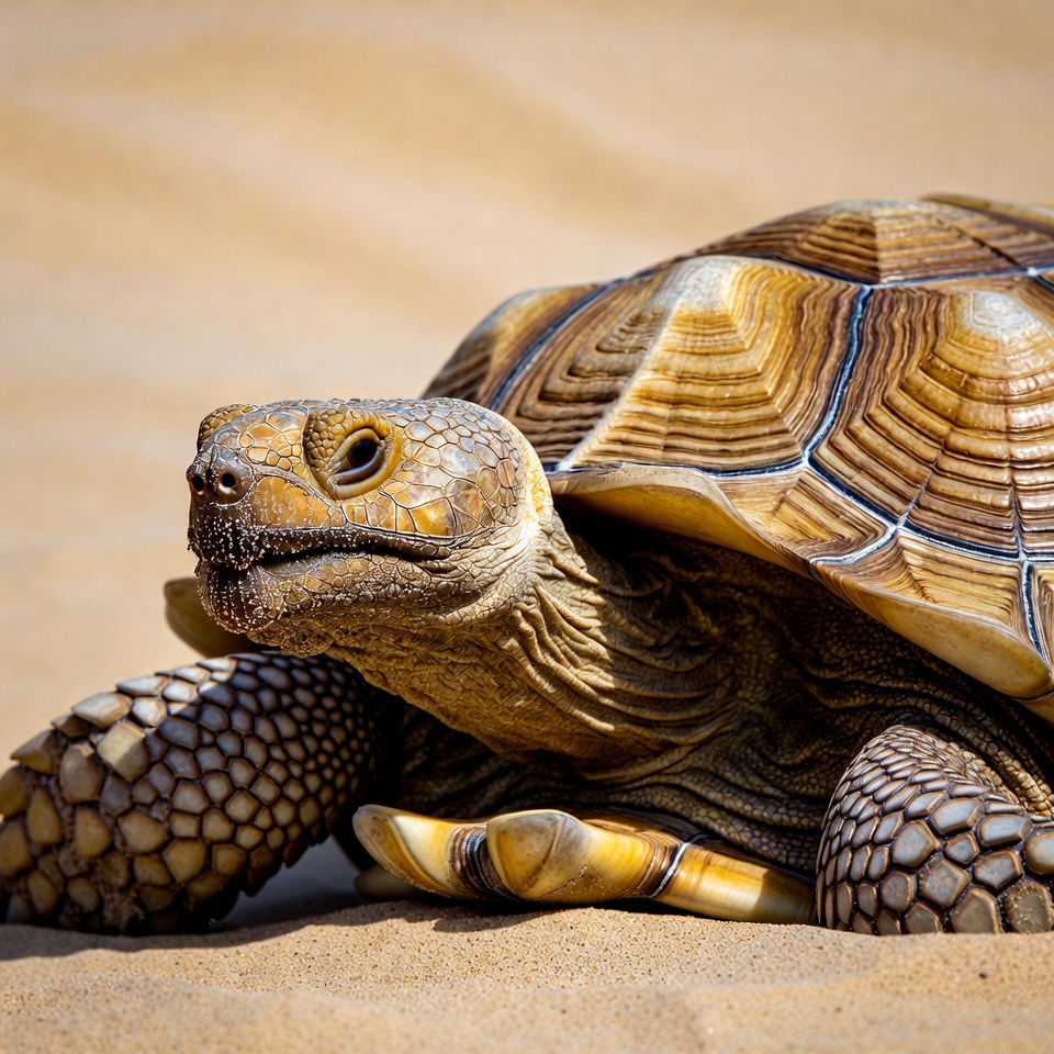 A large Sulcata tortoise with intricate brown and yellow shell patterns walks on a sandy desert background. Its textured head features prominent eyes and beak-like mouth. The tortoise's scaly legs and claws are visible as it moves forward.