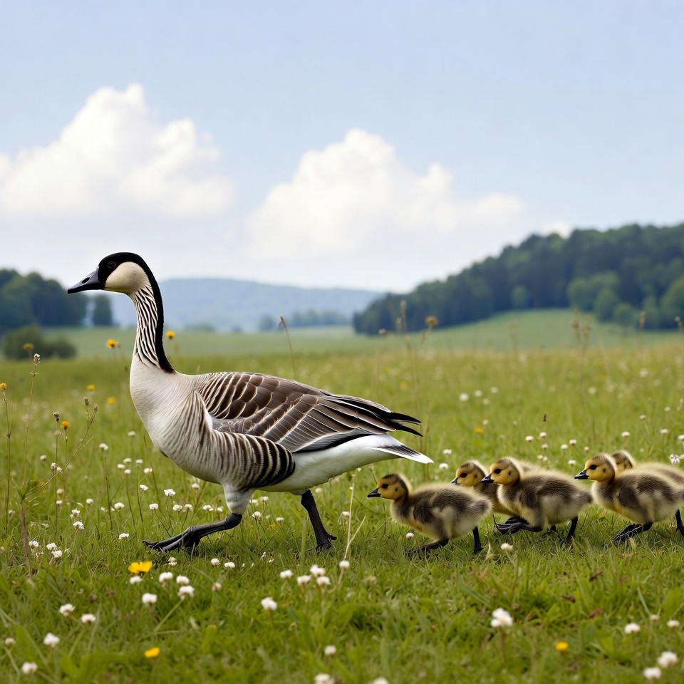 A mother goose with black and white markings walks through a green meadow dotted with yellow flowers. Five fluffy yellow goslings follow closely behind her. The scene features a blue sky with clouds and distant green hills.