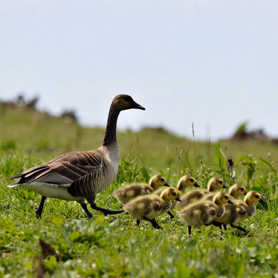 animal family, baby geese, birds, blue sky, brown goose, flock, goose family, goslings, grass field, green grass, hillside, meadow, nature, outdoors, walking goose, waterfowl, wildlife, yellow goslings, young geese, mother goose
