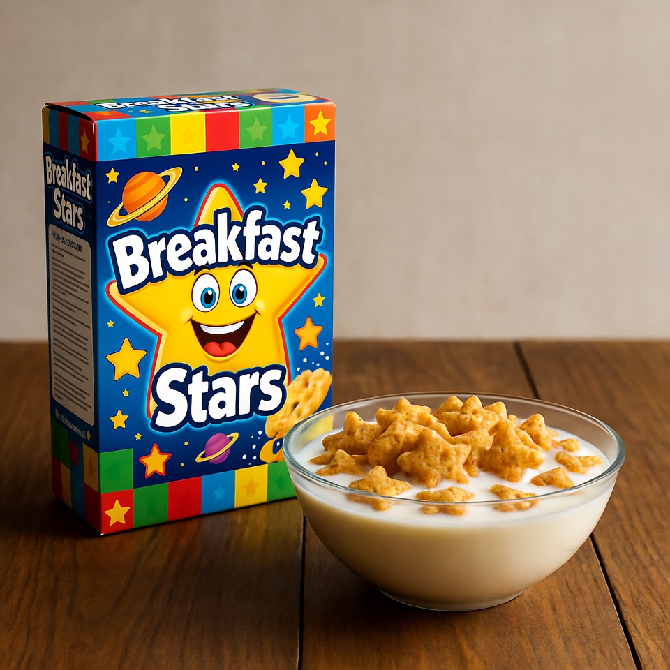 A colorful Breakfast Stars cereal box with a smiling star cartoon character sits on a wooden table next to a glass bowl filled with the star-shaped cereal and milk. The box features a blue starry space theme with rainbow colors and planets. The cereal pieces are golden and crispy, floating in white milk.