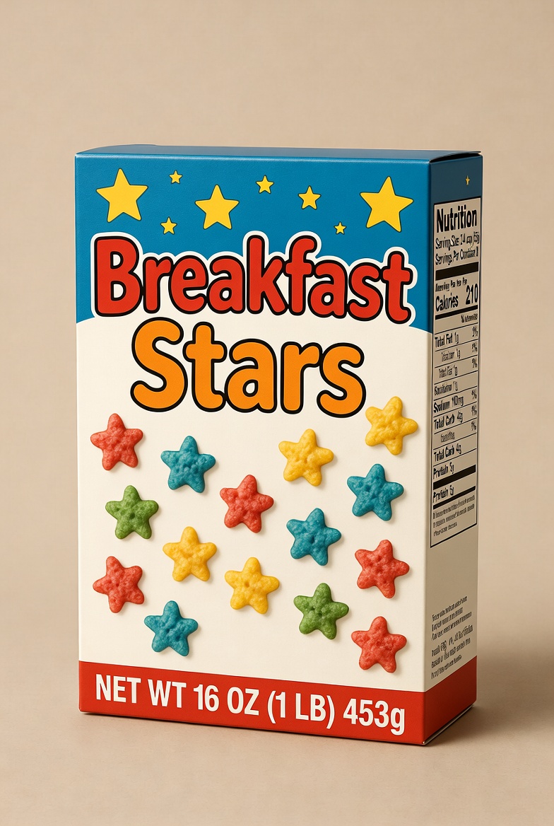 16 oz, blue box, blue stars, breakfast cereal, breakfast stars, colorful stars, food packaging, green stars, grocery product, illustration, isolated background, net weight, nutrition label, orange stars, red stars, star shaped, stars cereal, white box, yellow stars, cereal box